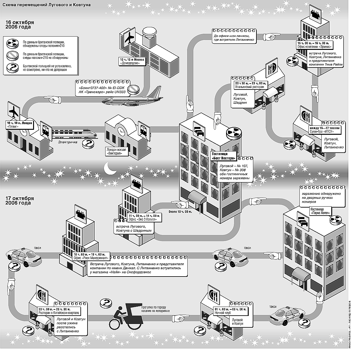 Посмотрим на (широко известную и впервые опубликованную в газете «Известия») схему перемещений Лугового и Ковтуна в промежутке между 16 и 18 октября (т. е. во время их первого визита в Лондон):